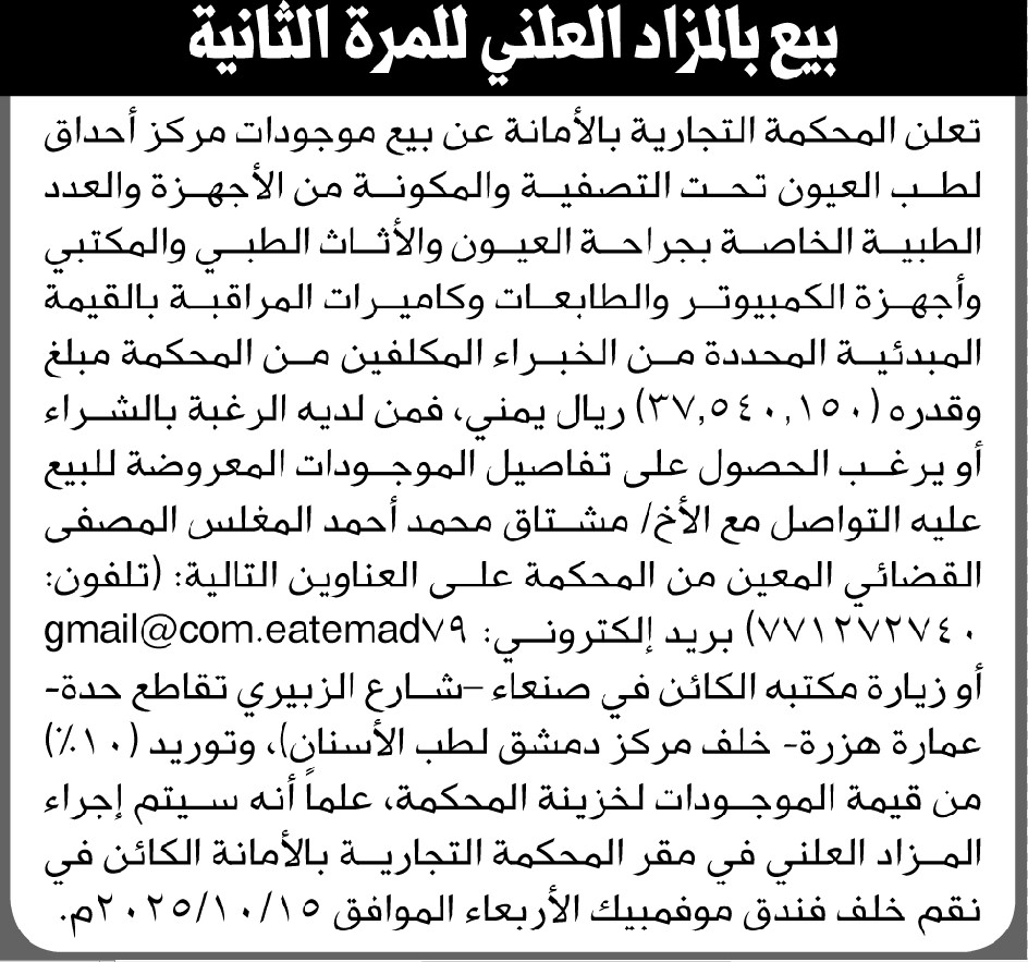 تعلن المحكمة التجارية بالأمانة عن بيع موجودات مركز أحداق لطب العيون إعلاناتمحاكم On أكتوبر 5, 2025 Share Share FacebookTwitterWhatsAppTelegramGoogle+البريد الإلكترونيPrint
