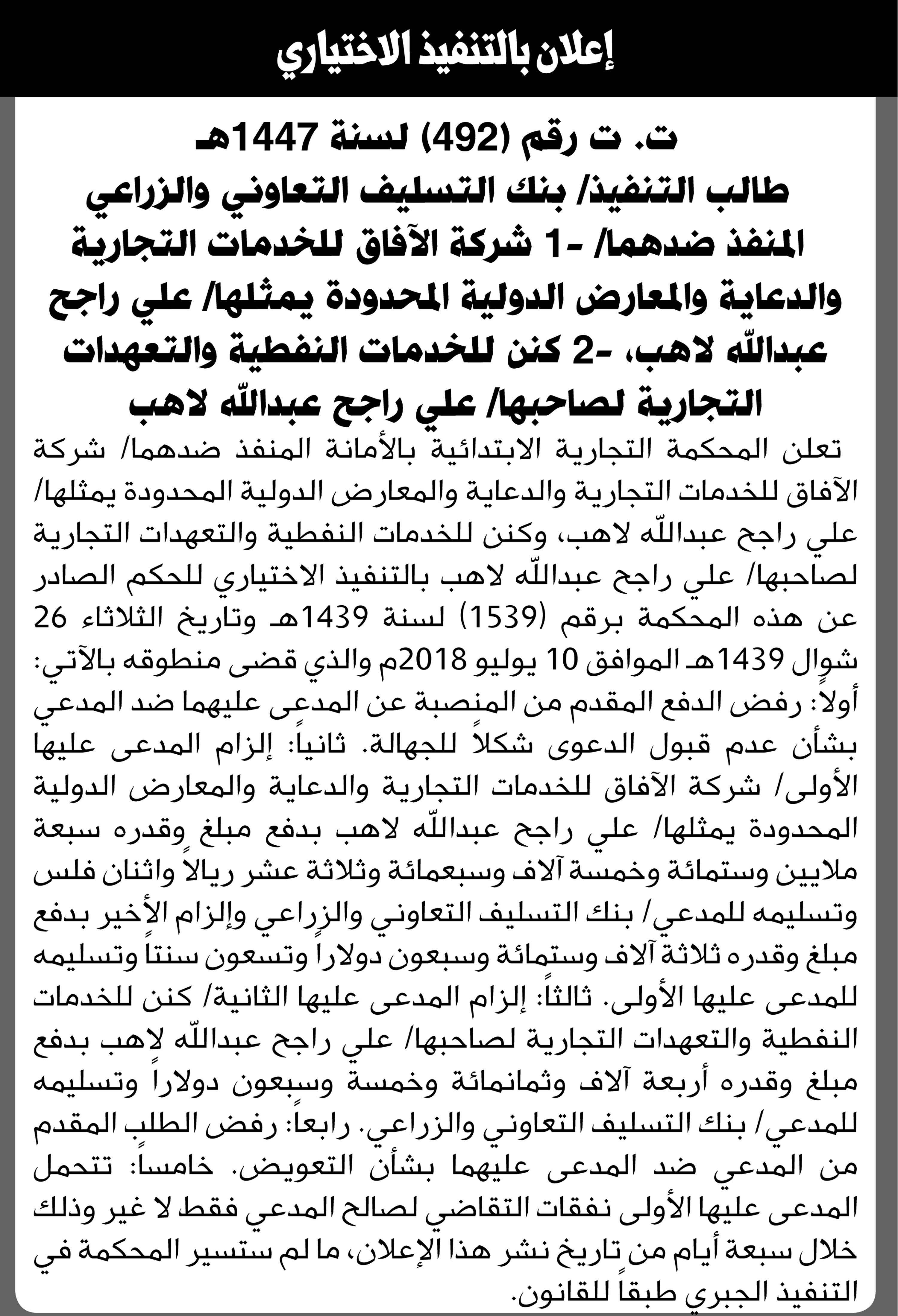 تعلن المحكمة التجارية بالأمانة للمنفذ ضدهما شركة الآفاق و كنن للخدمات النفطية بالتنفيذ الاختياري للحكم إعلاناتمحاكم On أكتوبر 5, 2025 Share Share FacebookTwitterWhatsAppTelegramGoogle+البريد الإلكترونيPrint