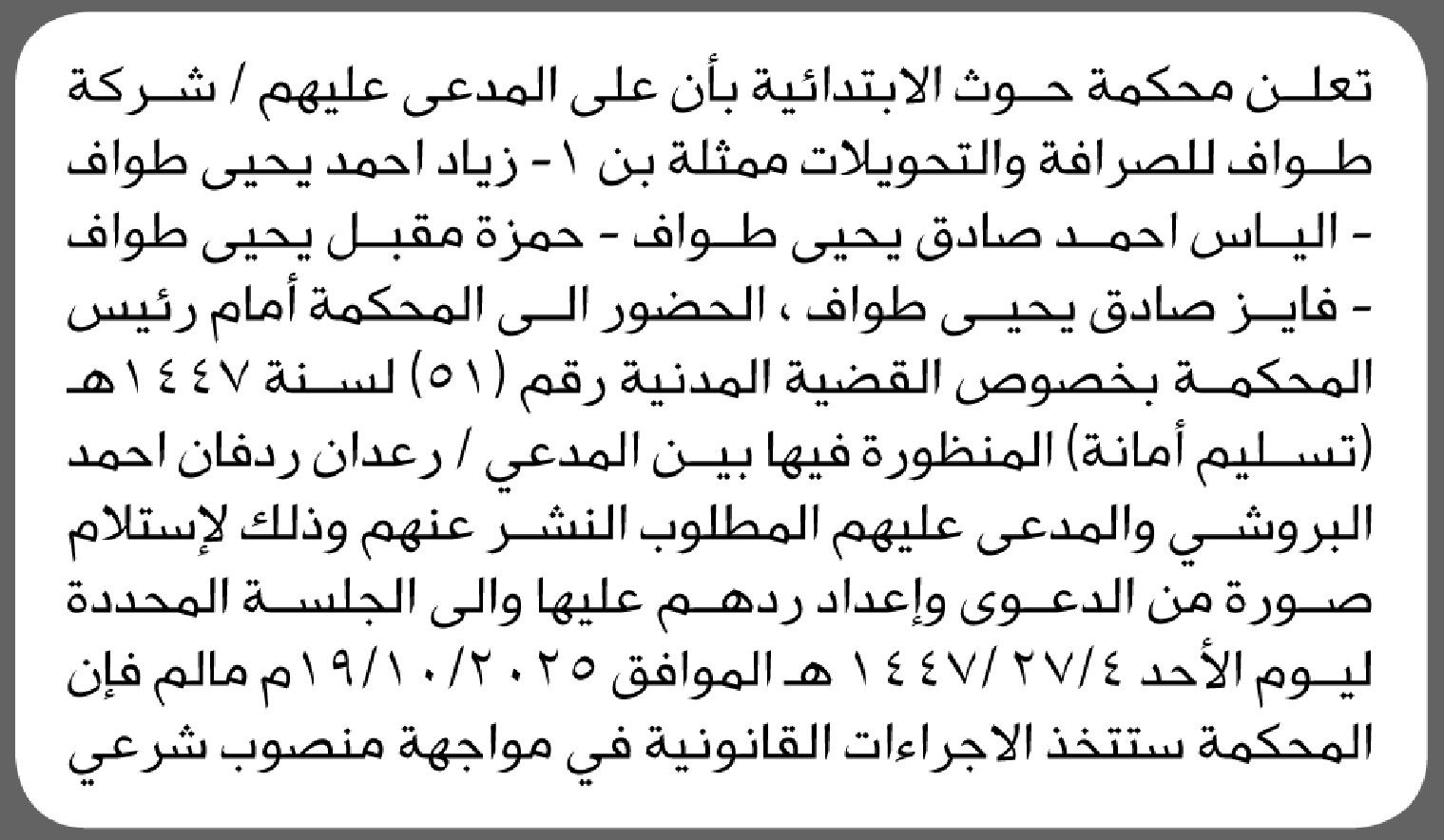 تعلن محكمة حوث بأن على المدعى عليهم ممثلو شركة طواف للصرافة الحضور إلى المحكمة إعلاناتمحاكم On أكتوبر 5, 2025 Share Share FacebookTwitterWhatsAppTelegramGoogle+البريد الإلكترونيPrint