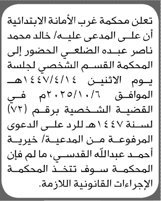 تعلن محكمة غرب الأمانة الابتدائية بأن على المدعى عليه/ خالد الضلعي الحضور إلى المحكمة إعلاناتمحاكم On أكتوبر 6, 2025 Share Share FacebookTwitterWhatsAppTelegramGoogle+البريد الإلكترونيPrint
