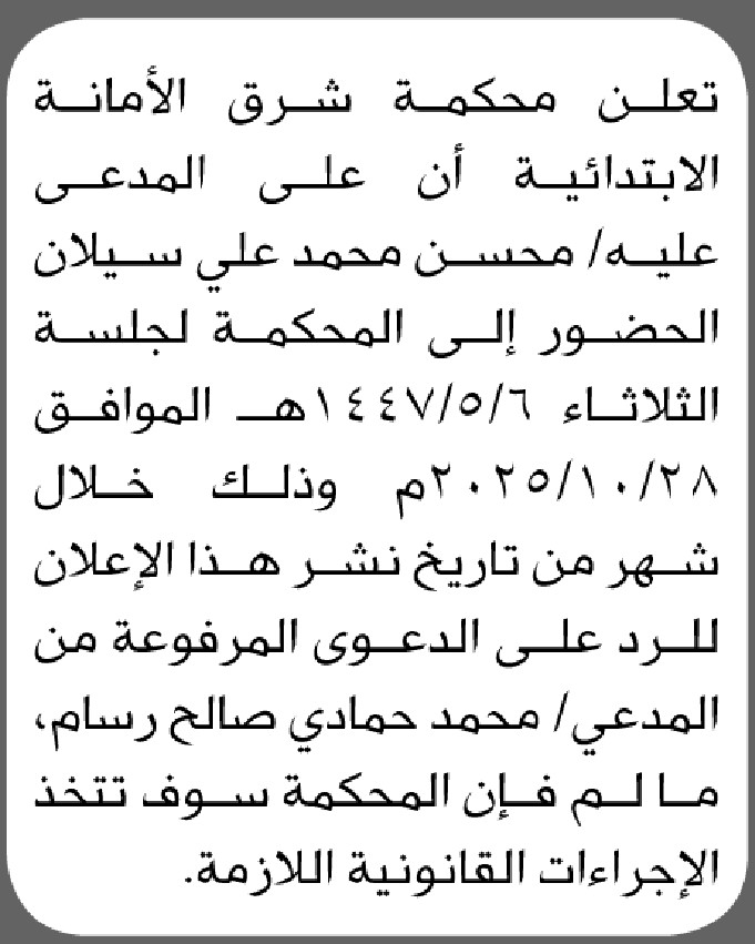 تعلن محكمة شرق الأمانة الابتدائية بأن على المدعى عليه/ محسن سيلان الحضور إلى المحكمة إعلاناتمحاكم On أكتوبر 6, 2025 Share Share FacebookTwitterWhatsAppTelegramGoogle+البريد الإلكترونيPrint