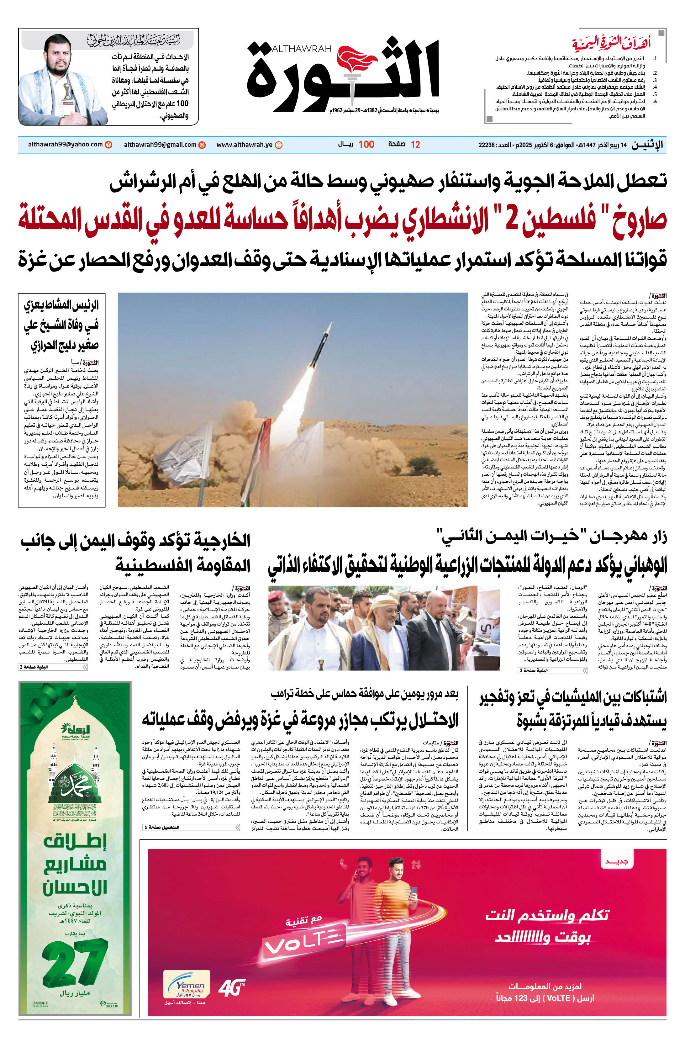 الصحيفة الورقية صحيفة الثورة 14 ربيع الاخر 1447 _ 6 اكتوبر 2025 On أكتوبر 6, 2025 Share View Fullscreen Share FacebookTwitterWhatsAppTelegramGoogle+البريد الإلكترونيPrint