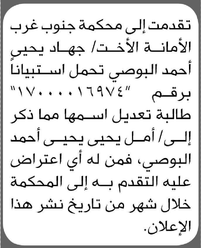 تعلن محكمة جنوب غرب الأمانة أن الأخت جهاد يحيى البوصي تقدم بطلب تعديل اسمها إعلاناتمحاكم On أكتوبر 6, 2025 Share Share FacebookTwitterWhatsAppTelegramGoogle+البريد الإلكترونيPrint