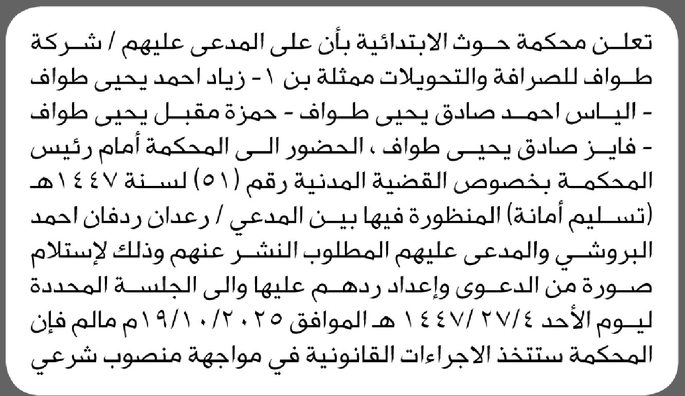 تعلن محكمة حوث بأن على المدعى عليهم شركة طواف للصرافة وآخرين الحضور إلى المحكمة إعلاناتمحاكم On أكتوبر 7, 2025 Share Share FacebookTwitterWhatsAppTelegramGoogle+البريد الإلكترونيPrint
