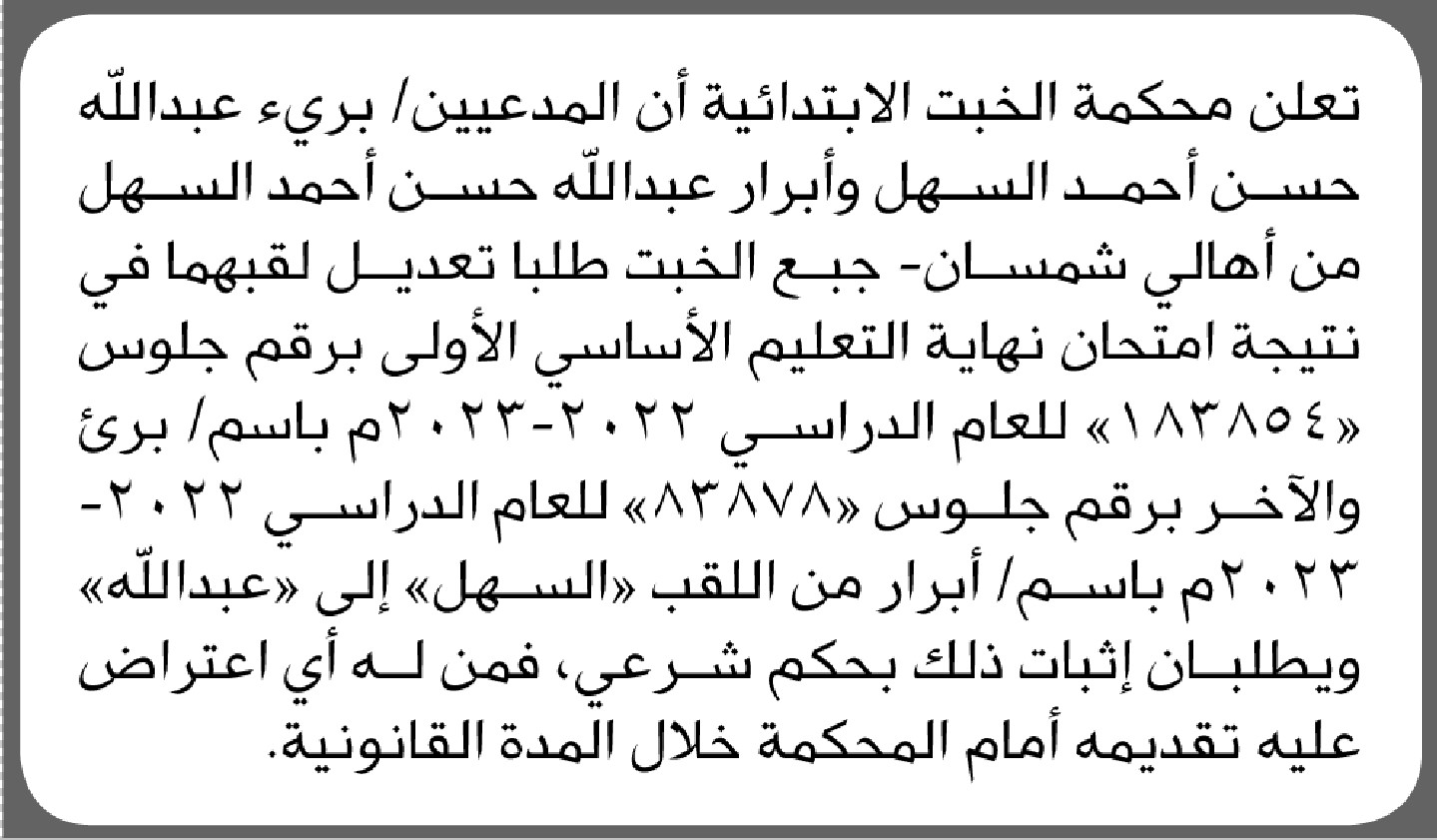 تعلن محكمة الخبت أن الأخوة بريء عبدالله السهل وأبرار السهل تقدما تطلب تعديل لقبهما إعلاناتمحاكم On أكتوبر 8, 2025 Share Share FacebookTwitterWhatsAppTelegramGoogle+البريد الإلكترونيPrint