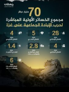 أفاد مركز معلومات فلسطين (مُعطى)، اليوم الثلاثاء، بأن إجمالي الخسائر الأولية المباشرة التي خلّفتها جريمة الإبادة الجماعية التي يرتكبها جيش العدو الإسرائيلي في قطاع غزة بلغ نحو 70 مليار دولار، موزعة على مختلف القطاعات الحيوية في القطاع.