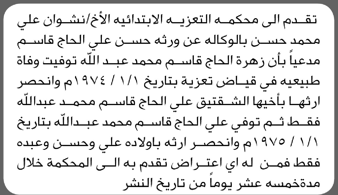 تقدم الى محكمة التعزية الاخ نشوان علي مدعيا وفاة زهرة الحاج وفاة طبيعية إعلاناتمحاكم On أكتوبر 8, 2025 Share Share FacebookTwitterWhatsAppTelegramGoogle+البريد الإلكترونيPrint