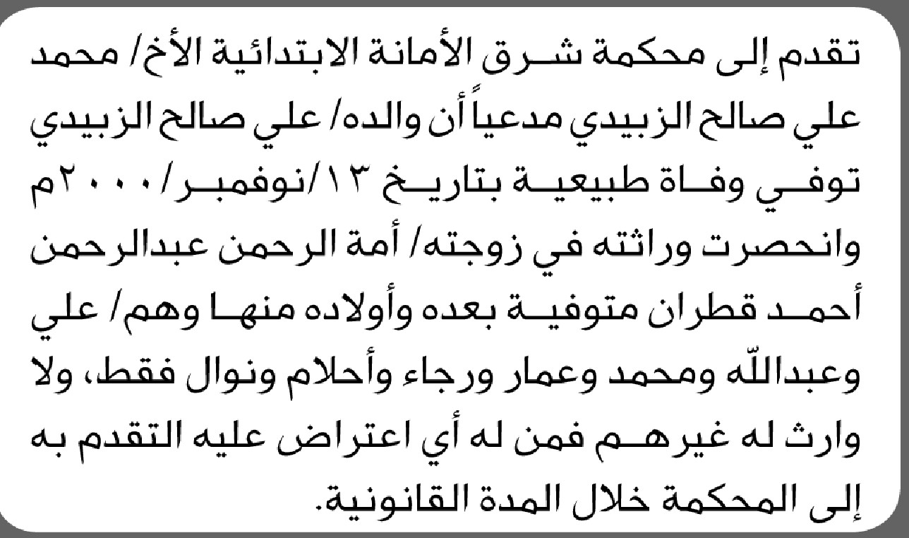 تقدم الى محكمة شرق الأخ محمد الزبيدي مدعيا وفاة والده وفاة طبيعية إعلاناتمحاكم On أكتوبر 8, 2025 Share Share FacebookTwitterWhatsAppTelegramGoogle+البريد الإلكترونيPrint