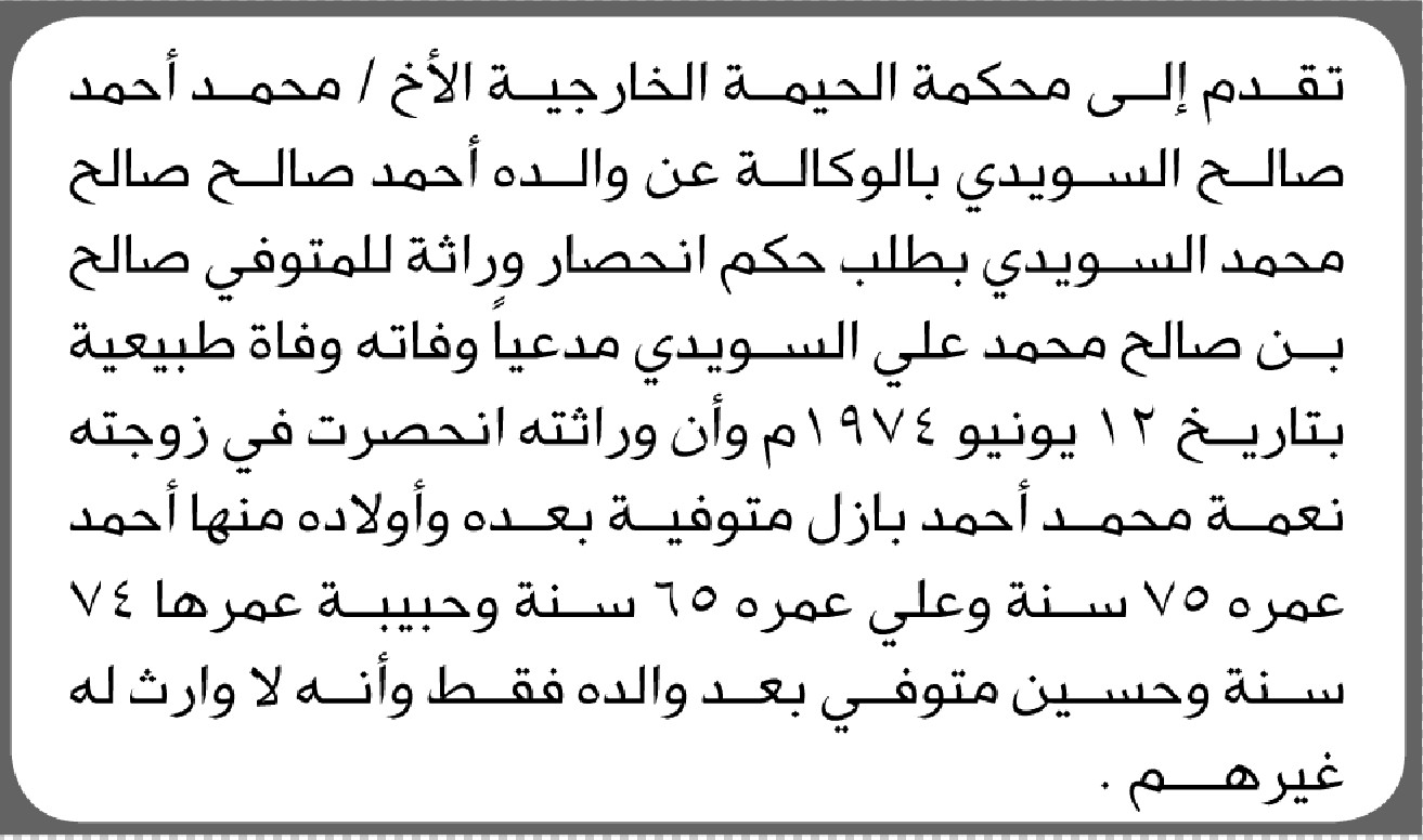 تقدم الى محكمة الحيمة الخارجية محمد السويدي بطلب إصدار حكم انحصار وراثة للمتوفي صالح السويدي إعلاناتمحاكم On أكتوبر 8, 2025 Share Share FacebookTwitterWhatsAppTelegramGoogle+البريد الإلكترونيPrint