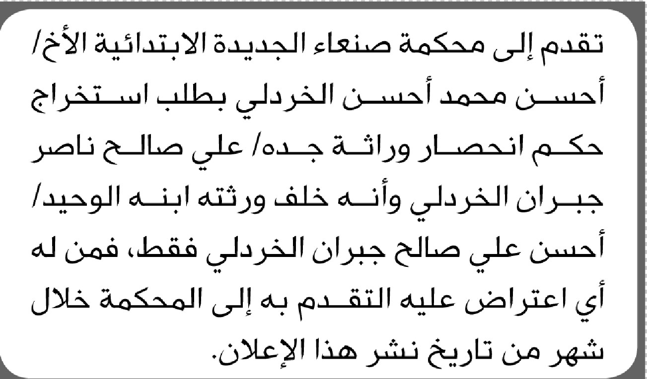 تقدم الى محكمة الى محكمة صنعاء الجديدة الأخ احسن الخردلي بطلب إصدار حكم وراثة لجده المتوفي إعلاناتمحاكم On أكتوبر 8, 2025 Share Share FacebookTwitterWhatsAppTelegramGoogle+البريد الإلكترونيPrint