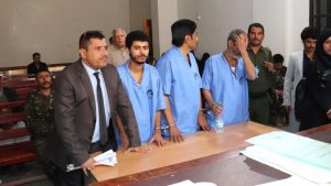 وبيّنت النيابة، أن المتهمين اليمنيين، رقم (38) علي صلاح بلال العواضي، ورقم (39) إبراهيم محمد علي النعيمي، قد أعانا السعودية وحلفاؤها في العدوان على اليمن، بأن جنّدا نفسيهما للتخابر معهم بقصد استهداف اليمنيين في المؤسسات العامة والخاصة وقاعات الأفراح والعزاء.