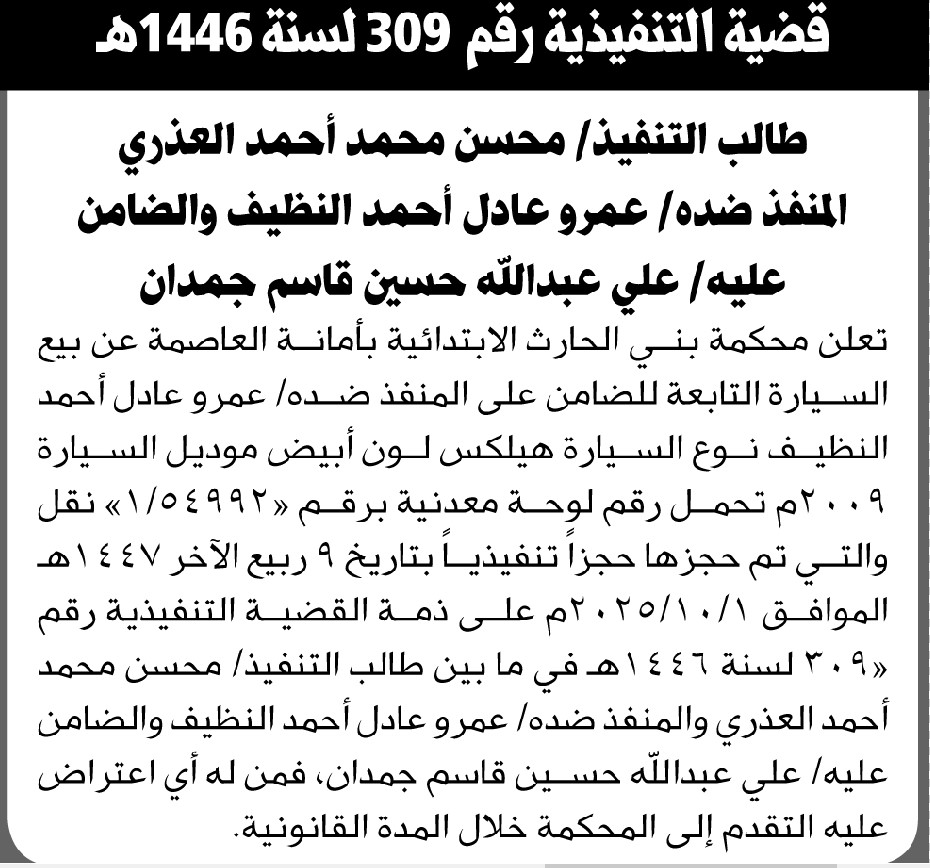 تعلن محكمة بني الحارث بأمانة العاصمة عن بيع السيارة التابعة للضامن إعلاناتمحاكم On أكتوبر 9, 2025 Share Share FacebookTwitterWhatsAppTelegramGoogle+البريد الإلكترونيPrint