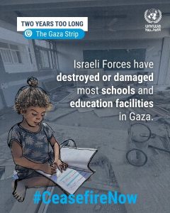 وأشارت المنظمة الأممية إلى أن حوالي 90٪ من مدارس الأونروا تعرضت للقصف أو للأضرار، وكثير منها قصفته “إسرائيل” أثناء إيوائها للعائلات النازحة.