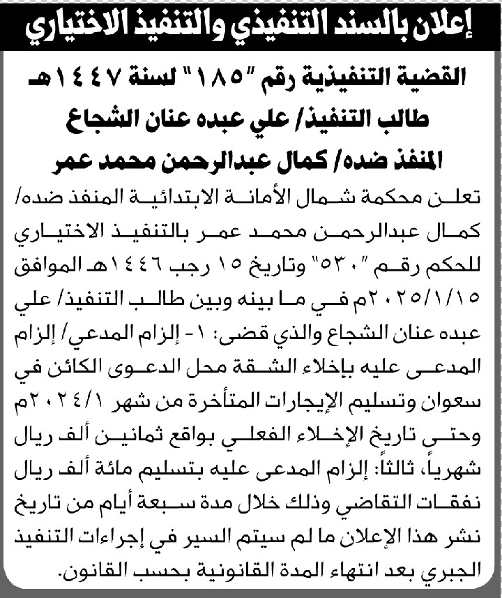 تعلن محكمة شمال الامانة بأن على المنفذ ضده/ كمال عمر التنفيذ الاختياري إعلاناتمحاكم On أكتوبر 9, 2025 Share Share FacebookTwitterWhatsAppTelegramGoogle+البريد الإلكترونيPrint