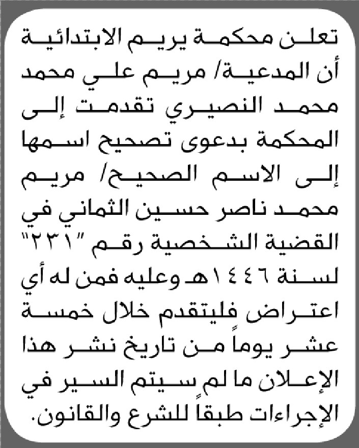 تعلن محكمة يريم الابتدائية بأن المدعية/ مريم النصيري تقدمت إليها بطلب تصحيح اسمها إعلاناتمحاكم On أكتوبر 9, 2025 Share Share FacebookTwitterWhatsAppTelegramGoogle+البريد الإلكترونيPrint