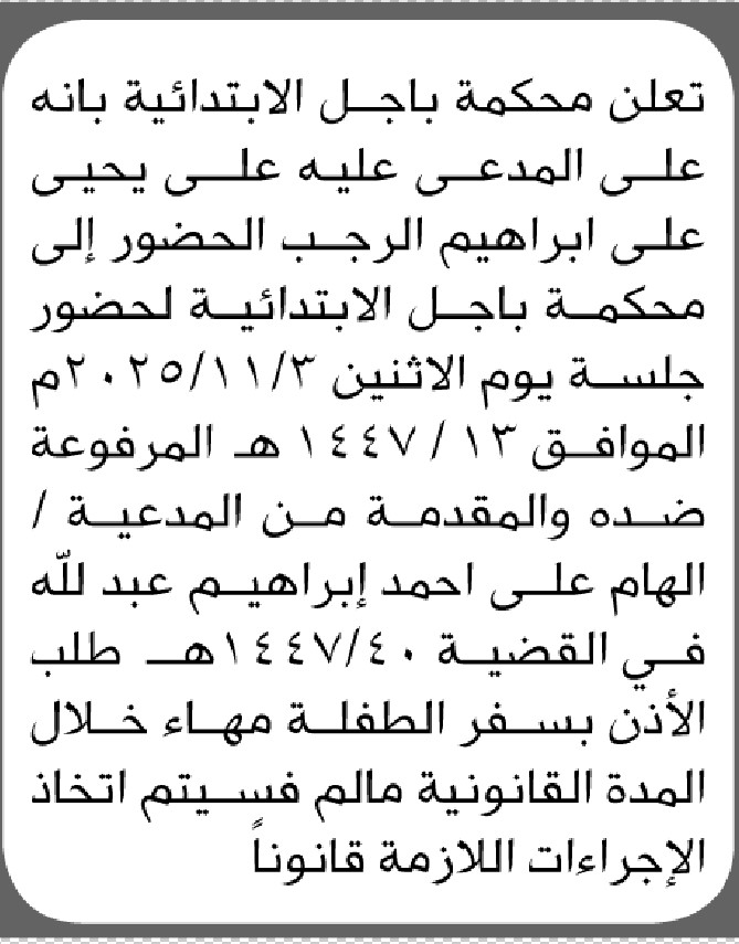 تعلن محكمة باجل أن على المدعى عليه علي يحيى الرجب الحضور إلى المحكمة إعلاناتمحاكم On أكتوبر 9, 2025 Share Share FacebookTwitterWhatsAppTelegramGoogle+البريد الإلكترونيPrint