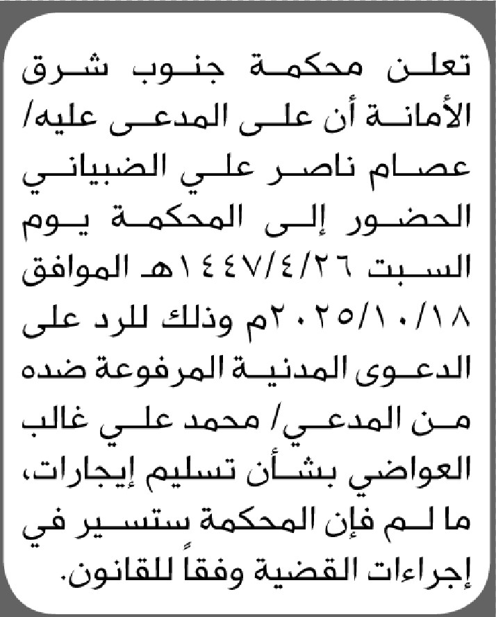 تعلن محكمة جنوب شرق الأمانة أن على المدعى عليه عصام ناصر الضبياني الحضور إلى المحكمة إعلاناتمحاكم On أكتوبر 9, 2025 Share Share FacebookTwitterWhatsAppTelegramGoogle+البريد الإلكترونيPrint
