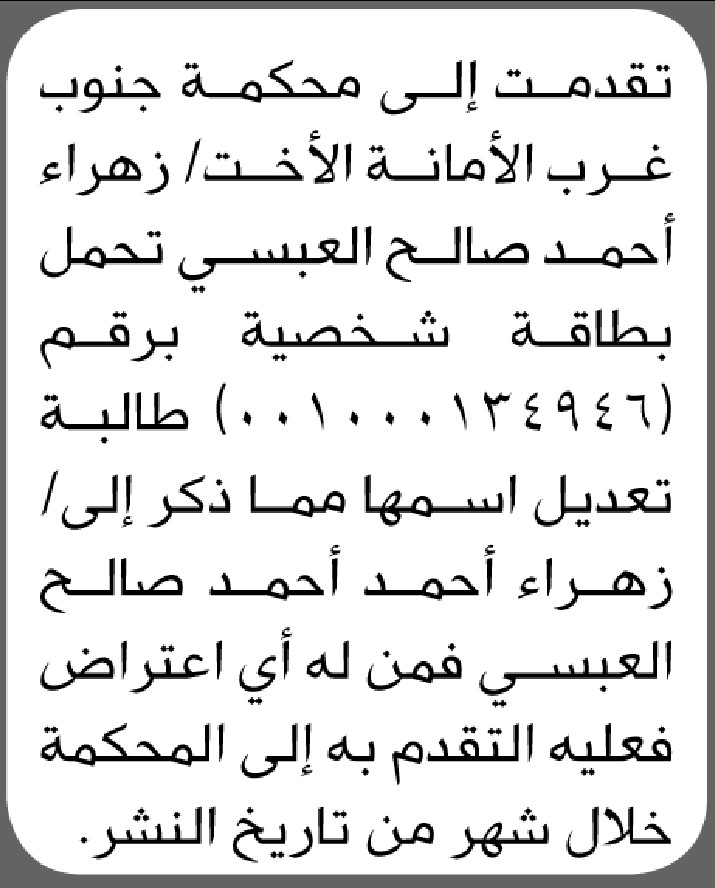 تعلن محكمة جنوب غرب الأمانة أن الأخت زهراء العبسي تقدمت بطلب تعديل اسمها إعلاناتمحاكم On أكتوبر 9, 2025 Share Share FacebookTwitterWhatsAppTelegramGoogle+البريد الإلكترونيPrint