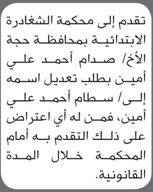 تعلن محكمة الشغادرة أن الأخ صدام أحمد علي تقدم بطلب تعديل اسمه إعلاناتمحاكم On أكتوبر 10, 2025 Share Share FacebookTwitterWhatsAppTelegramGoogle+البريد الإلكترونيPrint