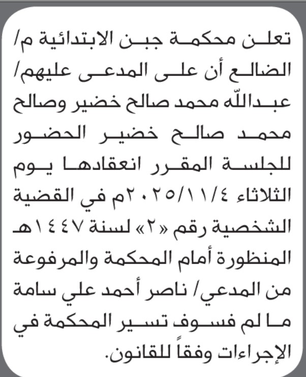 تعلن محكمة جبن أن على المدعى عليهم عبدالله خضير و صالح خضير الحضور إلى المحكمة إعلاناتمحاكم On أكتوبر 10, 2025 Share Share FacebookTwitterWhatsAppTelegramGoogle+البريد الإلكترونيPrint