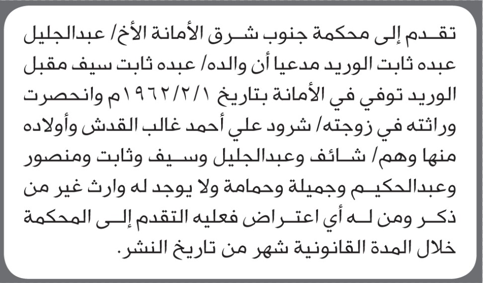 تعلن محكمة جنوب شرق الأمانة أن الأخ عبدالجليل عبده الوريد تقدم بدعوى انحصار وراثة إعلاناتمحاكم On أكتوبر 10, 2025 Share Share FacebookTwitterWhatsAppTelegramGoogle+البريد الإلكترونيPrint