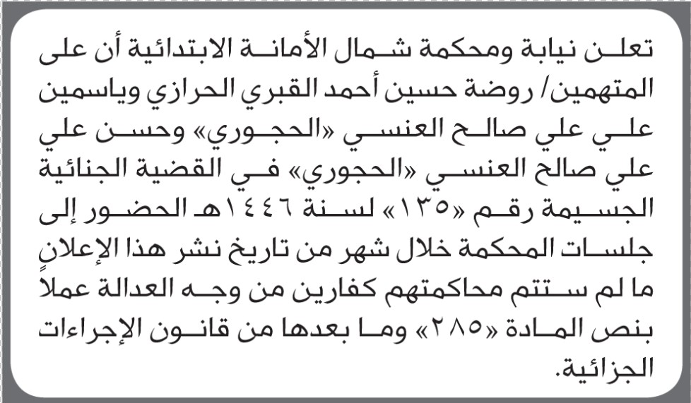 تعلن نيابة ومحكمة شمال الأمانة أن على المتهمين روضة الحرازي وآخرين الحضور إلى المحكمة إعلاناتمحاكم On أكتوبر 10, 2025 Share Share FacebookTwitterWhatsAppTelegramGoogle+البريد الإلكترونيPrint