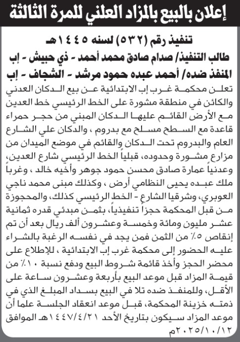 تعلن محكمة غرب إب الابتدائية عن بيع عقار المنفذ ضده/ أحمد مرشد إعلاناتمحاكم On أكتوبر 10, 2025 Share Share FacebookTwitterWhatsAppTelegramGoogle+البريد الإلكترونيPrint