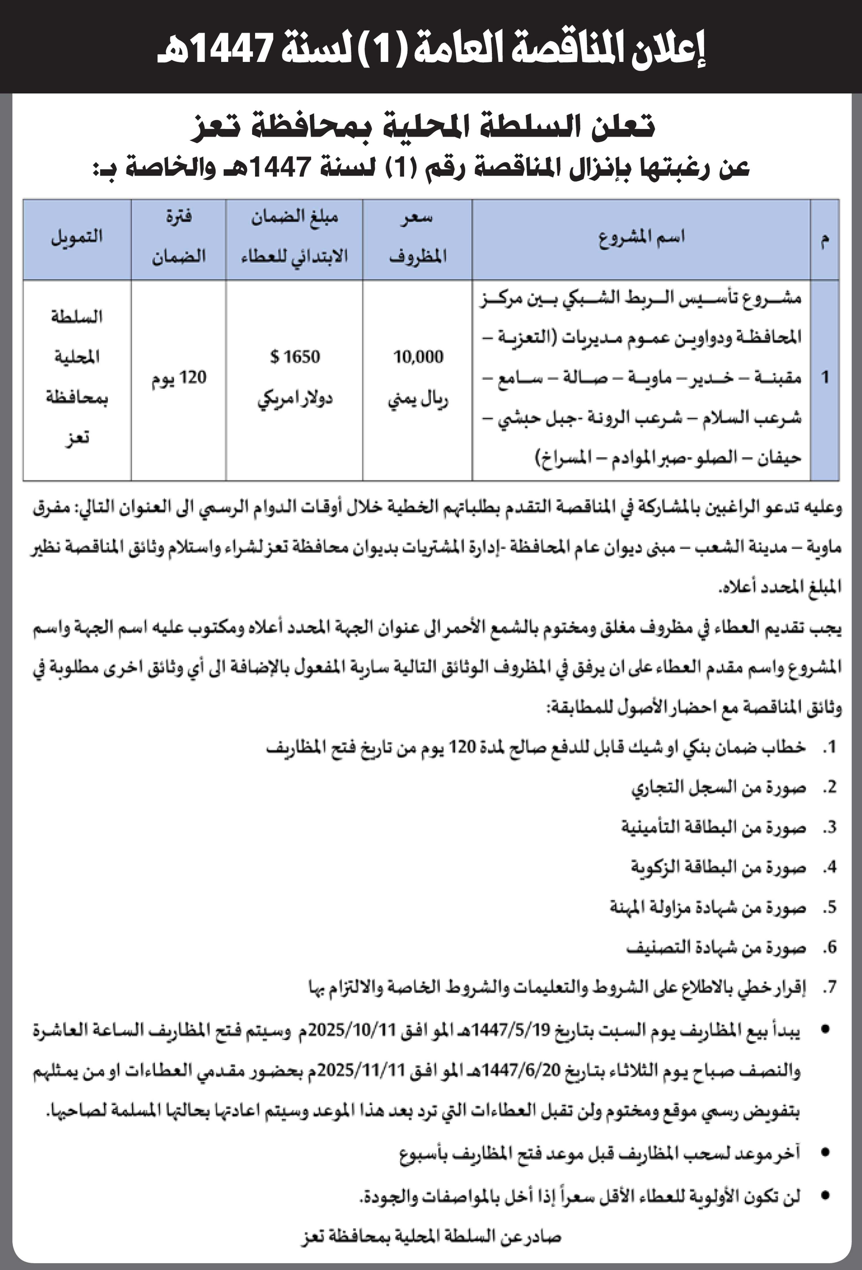 تعلن السلطة المحلية م/ تعز عن رغبتها بإنزال مناقصة عامة إعلاناتمناقصات On أكتوبر 10, 2025 Share Share FacebookTwitterWhatsAppTelegramGoogle+البريد الإلكترونيPrint