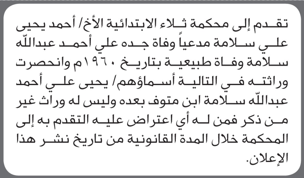 تعلن محكمة ثلاء الابتدائية بأن الأخ/ أحمد سلامة تقدم إليها بطلب انحصار ورثة إعلاناتمحاكم On أكتوبر 10, 2025 Share Share FacebookTwitterWhatsAppTelegramGoogle+البريد الإلكترونيPrint