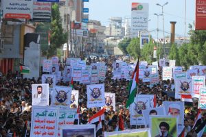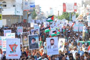 ورفع المشاركون الأعلام اليمنية والفلسطينية وصور الشهداء، إلى جانب الشعارات والهتافات المؤيدة للمقاومة الفلسطينية في قطاع غزة.