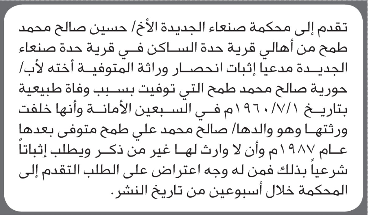 تقدم الى محكمة صنعاء الجديدة الأخ/ حسين طمح بطلب إنحصار وراثة إعلاناتمحاكم On أكتوبر 10, 2025 Share Share FacebookTwitterWhatsAppTelegramGoogle+البريد الإلكترونيPrint