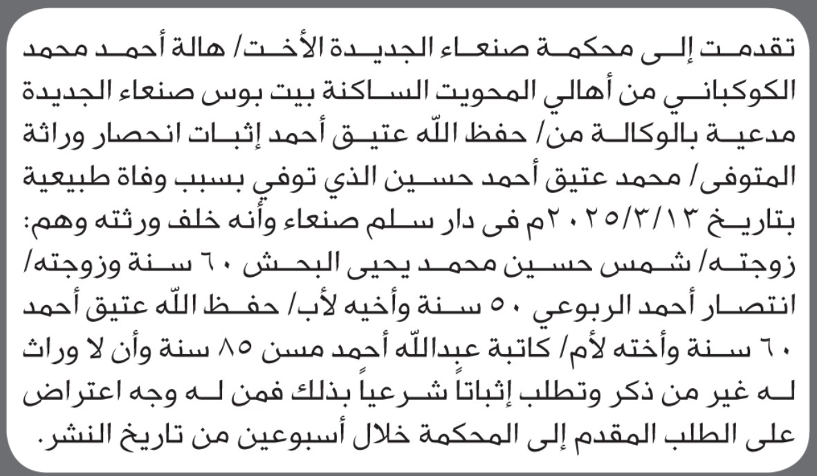 تقدم الى محكمة صنعاء الجديدة الأخت/ هالة الكوكباني بطلب إنحصار وراثة إعلاناتمحاكم On أكتوبر 10, 2025 Share Share FacebookTwitterWhatsAppTelegramGoogle+البريد الإلكترونيPrint