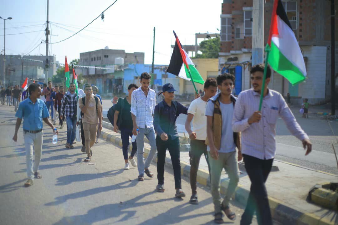 وفي المسير، الذي تقدمه رئيس الجامعة الدكتور محمد احمد الاهدل، رفع المشاركون العلمين اليمني والفلسطيني.