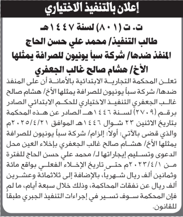 تعلن المحكمة التجارية بالأمانة بأن على المنفذ ضدها/ شركة سبأ للصرافة التنفيذ الأختياري إعلاناتمحاكم On أكتوبر 12, 2025 Share Share FacebookTwitterWhatsAppTelegramGoogle+البريد الإلكترونيPrint