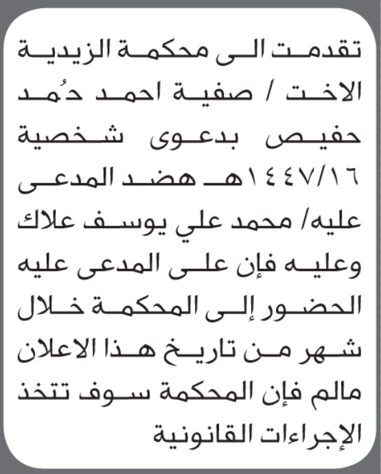 تعلن المحكمة الزيدية بأن على المدعى عليه/ محمد علاك الحضور إلى المحكمة إعلاناتمحاكم On أكتوبر 12, 2025 Share Share FacebookTwitterWhatsAppTelegramGoogle+البريد الإلكترونيPrint