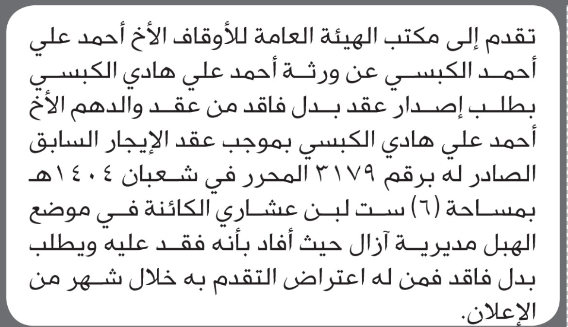 تقدم الى مكتب الهيئة العامة للأوقاف الأخ أحمد الكبسي بطلب إصدار عقد بدل فاقد إعلاناتاخرى On أكتوبر 12, 2025 Share Share FacebookTwitterWhatsAppTelegramGoogle+البريد الإلكترونيPrint