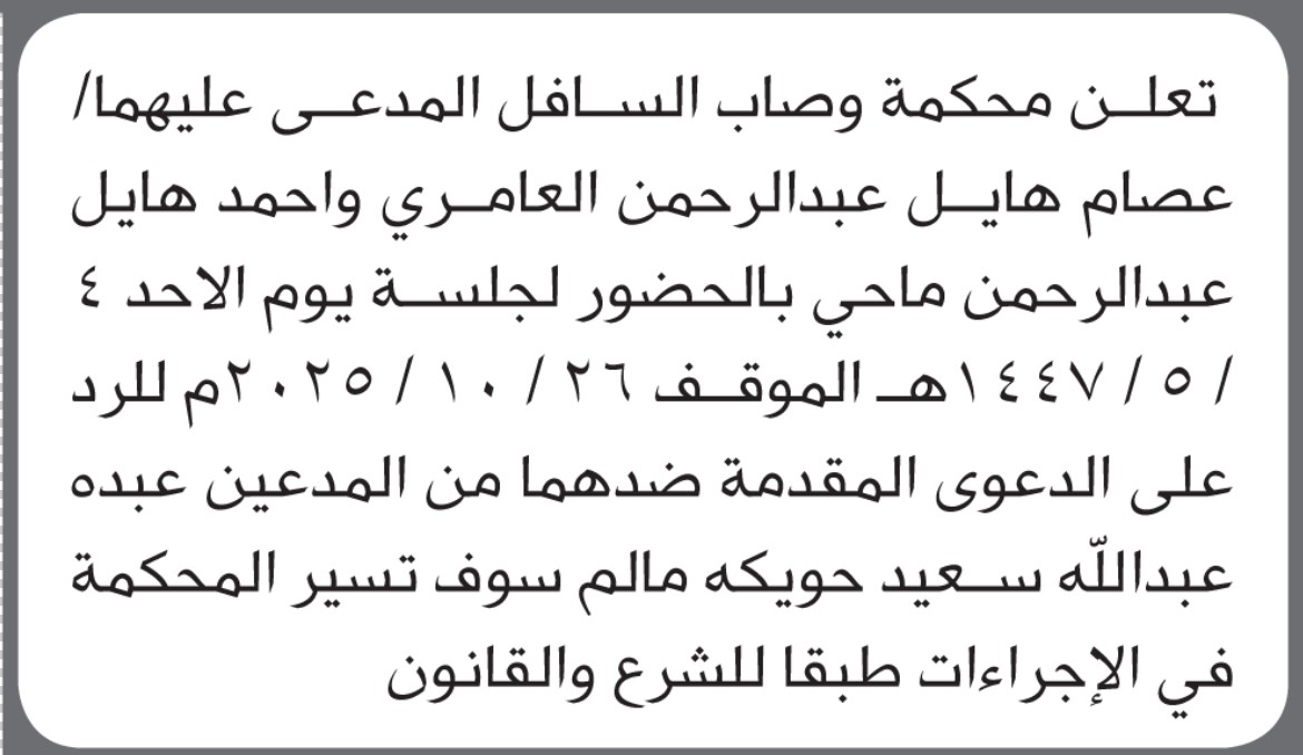 تعلن محكمة وصاب السافل أن على المدعى عليهما الحضور الى المحكمة إعلاناتمحاكم On أكتوبر 12, 2025 Share Share FacebookTwitterWhatsAppTelegramGoogle+البريد الإلكترونيPrint