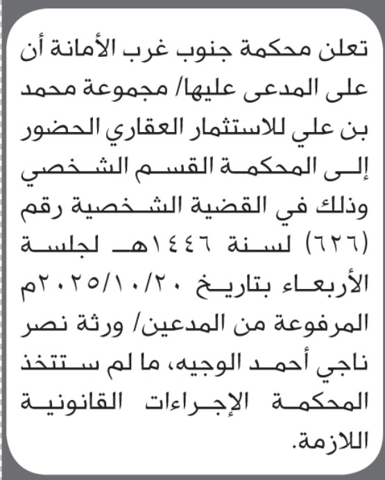 تعلن محكمة جنوب غرب الأمانة أن على المدعى عليها مجموعة محمد بن علي الحضور إلى المحكمة إعلاناتمحاكم On أكتوبر 12, 2025 Share Share FacebookTwitterWhatsAppTelegramGoogle+البريد الإلكترونيPrint