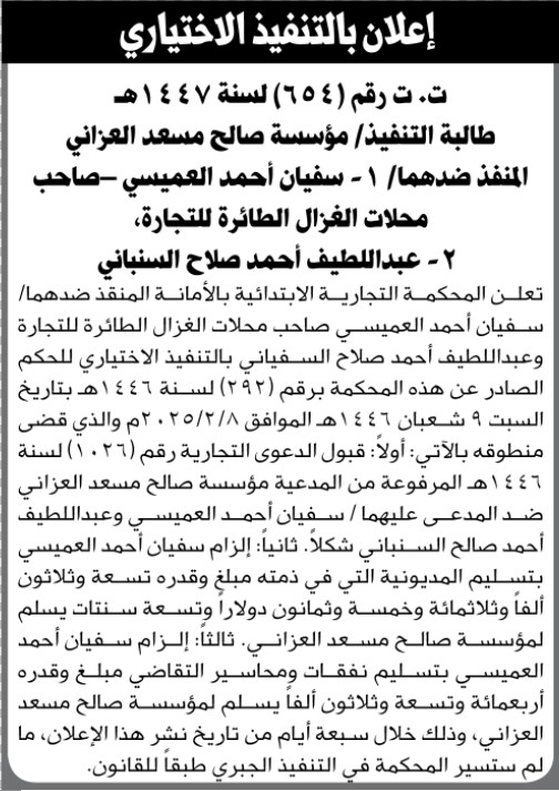 تعلن المحكمة التجارية بالأمانة أن على المنفذ ضدهما التنفيذ الإختياري للحكم إعلاناتمحاكم On أكتوبر 13, 2025 Share Share FacebookTwitterWhatsAppTelegramGoogle+البريد الإلكترونيPrint