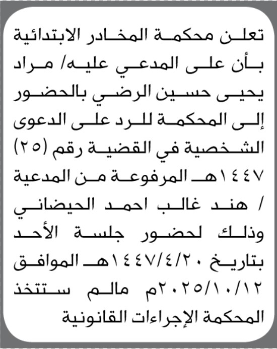 تعلن المحكمة المخادر بأن على المدعى عليه/ مراد الرضي الحضور إلى المحكمة إعلاناتمحاكم On أكتوبر 13, 2025 Share Share FacebookTwitterWhatsAppTelegramGoogle+البريد الإلكترونيPrint
