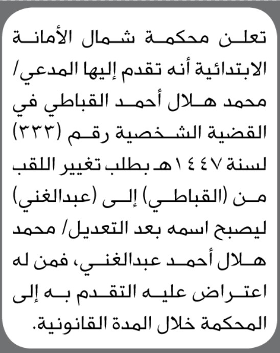 تعلن محكمة شمال الأمانة بأن المدعي/ محمد القباطي تقدم إليها بطلب تغيير اللقب إعلاناتمحاكم On أكتوبر 13, 2025 Share Share FacebookTwitterWhatsAppTelegramGoogle+البريد الإلكترونيPrint