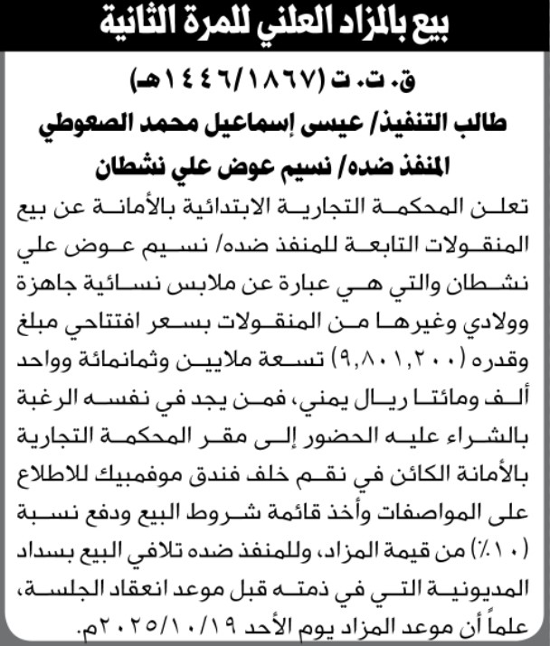 تعلن المحكمة التجارية بالأمانة عن بيع المنقولات التابعة للمنفذ ضده نسيم عوض نشطان إعلاناتمحاكم On أكتوبر 13, 2025 Share Share FacebookTwitterWhatsAppTelegramGoogle+البريد الإلكترونيPrint