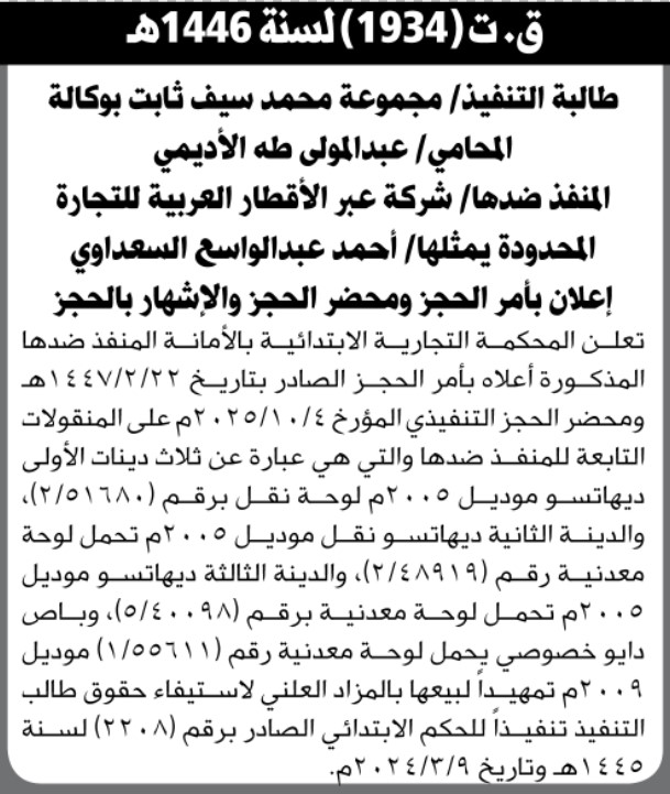 تعلن المحكمة التجارية بالأمانة للمنفذ ضدها شركة عبر الأقطار بأمر الحجز الصادر إعلاناتمحاكم On أكتوبر 13, 2025 Share Share FacebookTwitterWhatsAppTelegramGoogle+البريد الإلكترونيPrint