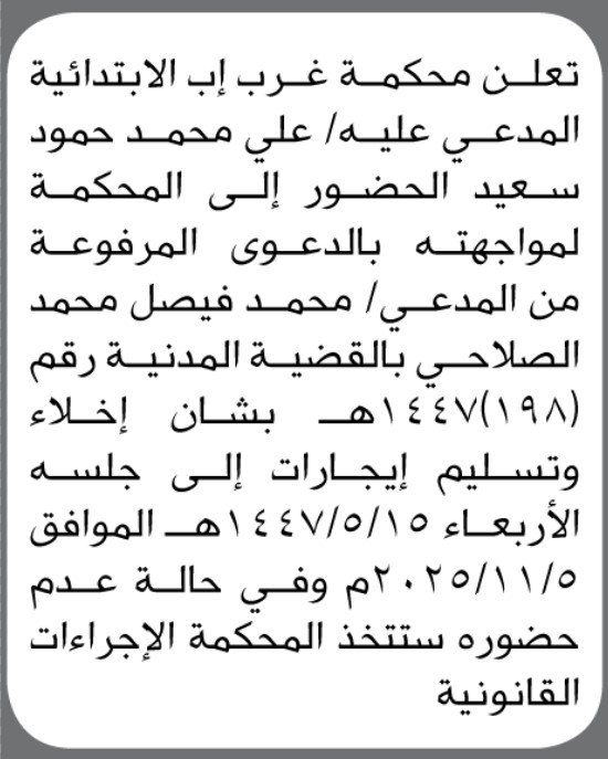 تعلن محكمة غرب إب بأن على المدعى عليه/ علي سعيد الحضور إلى المحكمة إعلاناتمحاكم On أكتوبر 13, 2025 Share Share FacebookTwitterWhatsAppTelegramGoogle+البريد الإلكترونيPrint