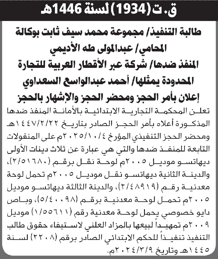 تعلن المحكمة التجارية بالامانة عن الامر بالحجز والاشهار على المنقولات التابعة للمنفذ ضدها شركة عبر الاقطار العربية للتجارة إعلاناتمحاكم On أكتوبر 14, 2025 Share Share FacebookTwitterWhatsAppTelegramGoogle+البريد الإلكترونيPrint