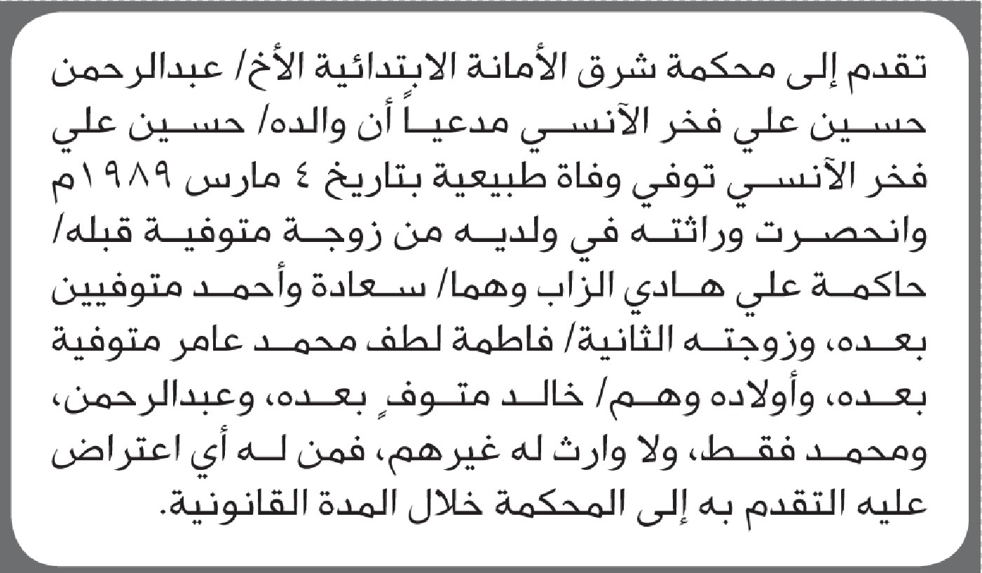 تقدم الى محكمة شرق الأمانة الأخ عبدالرحمن الانسي مدعيا ان والده توفي وفاة طبيعية إعلاناتمحاكم On أكتوبر 14, 2025 Share Share FacebookTwitterWhatsAppTelegramGoogle+البريد الإلكترونيPrint