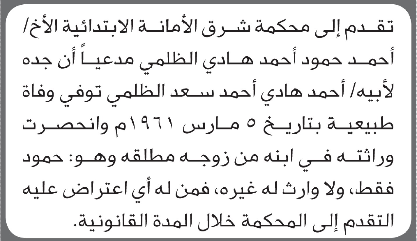 تعلن محكمة شرق الأمانة أن الأخ أحمد حمود الظلمي تقدم بدعوى انحصار وراثة إعلاناتمحاكم On أكتوبر 14, 2025 Share Share FacebookTwitterWhatsAppTelegramGoogle+البريد الإلكترونيPrint