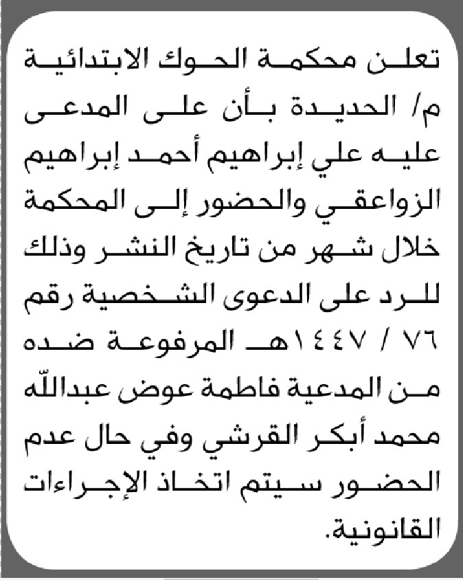 تعلن محكمة الحوك الابتدائية بأن على/ علي الزواعقي الحضور إلى المحكمة إعلاناتمحاكم On أكتوبر 15, 2025 Share Share FacebookTwitterWhatsAppTelegramGoogle+البريد الإلكترونيPrint