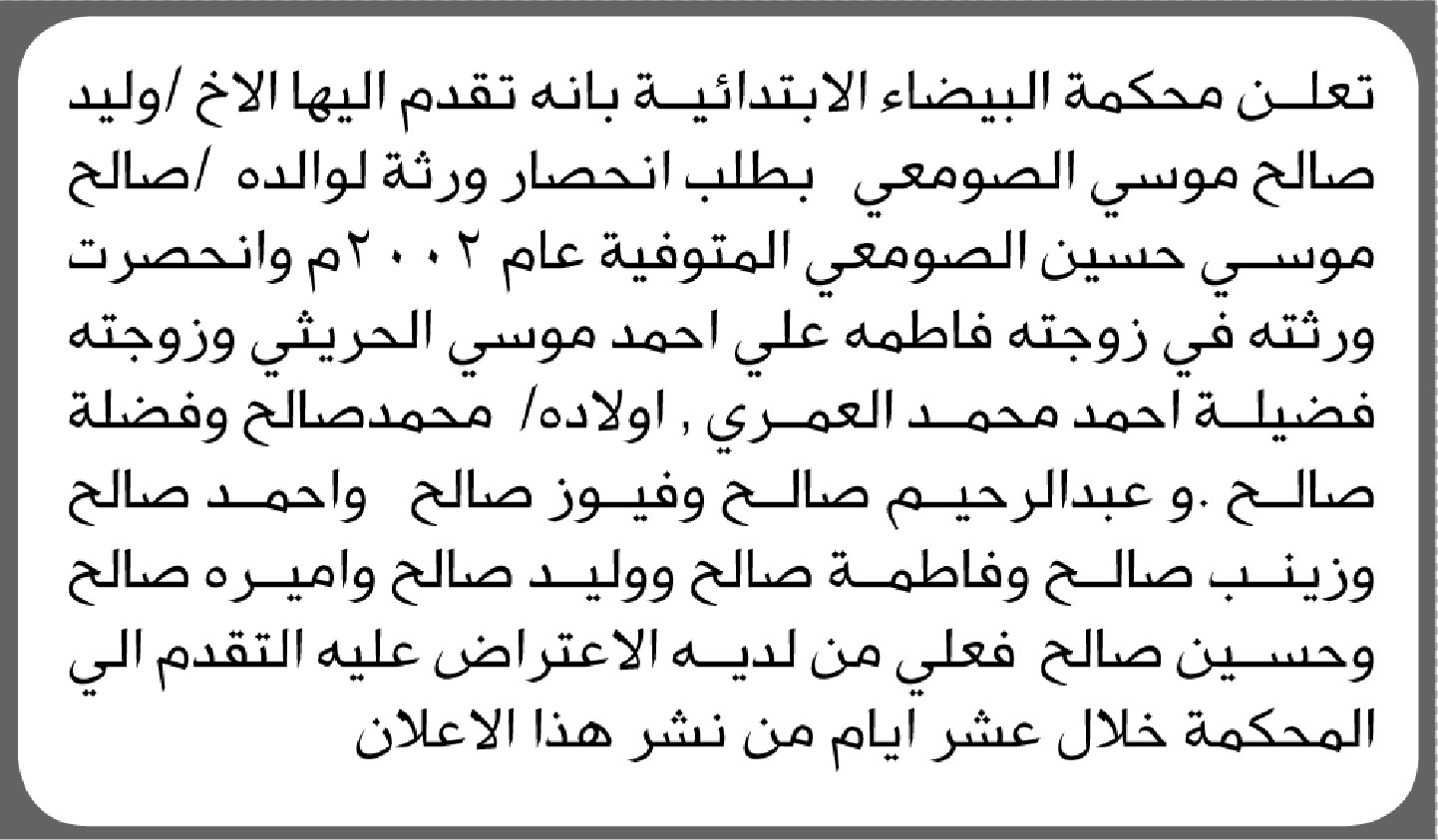 تعلن محكمة البيضاء بأن الأخ وليد صالح الصومعي تقدم بدعوى انحصار وراثة إعلاناتمحاكم On أكتوبر 15, 2025 Share Share FacebookTwitterWhatsAppTelegramGoogle+البريد الإلكترونيPrint