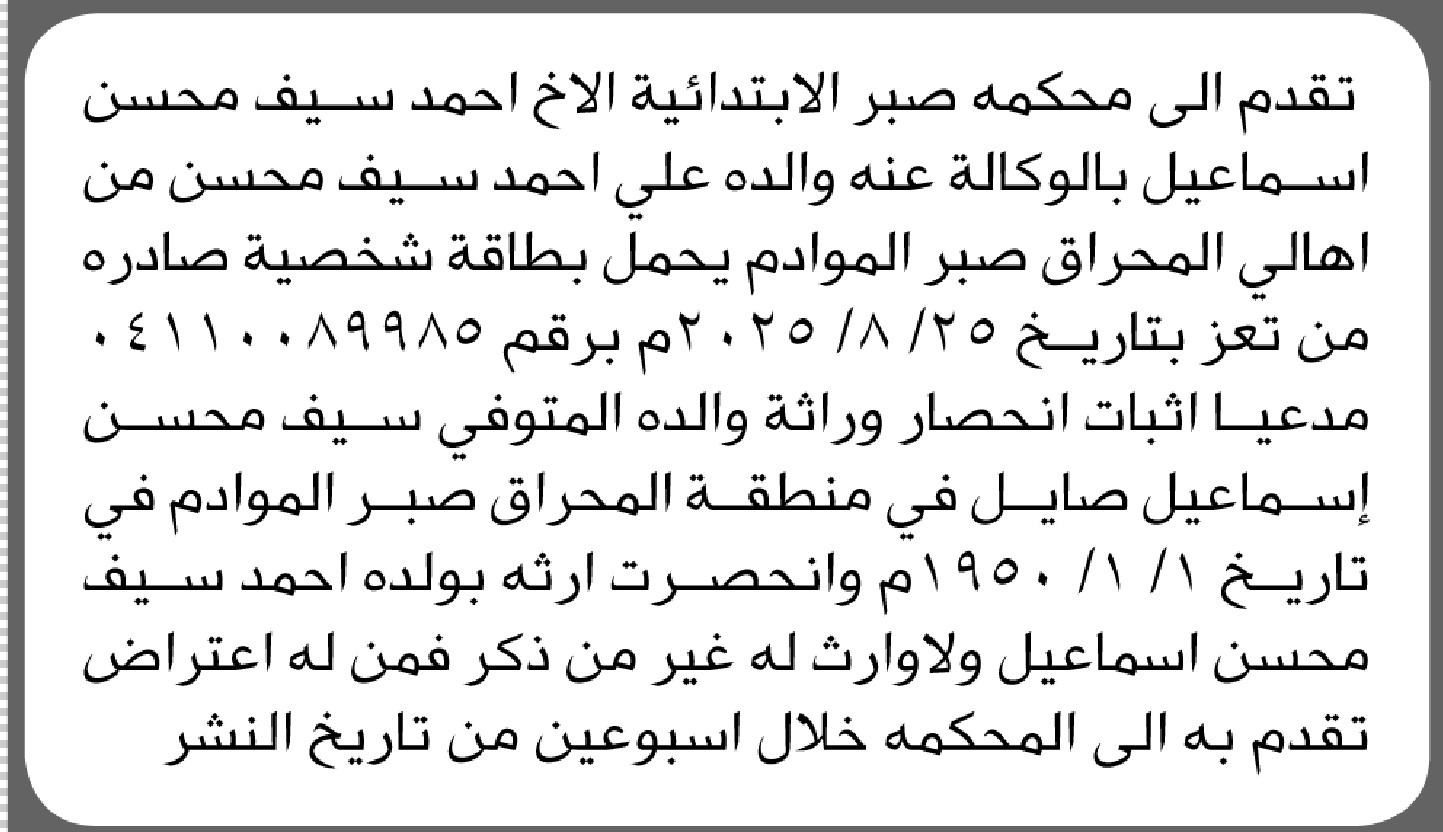 تعلن محكمة صبر أن الأخ أحمد سيف محسن تقدم بدعوى انحصار وراثة إعلاناتمحاكم On أكتوبر 15, 2025 Share Share FacebookTwitterWhatsAppTelegramGoogle+البريد الإلكترونيPrint